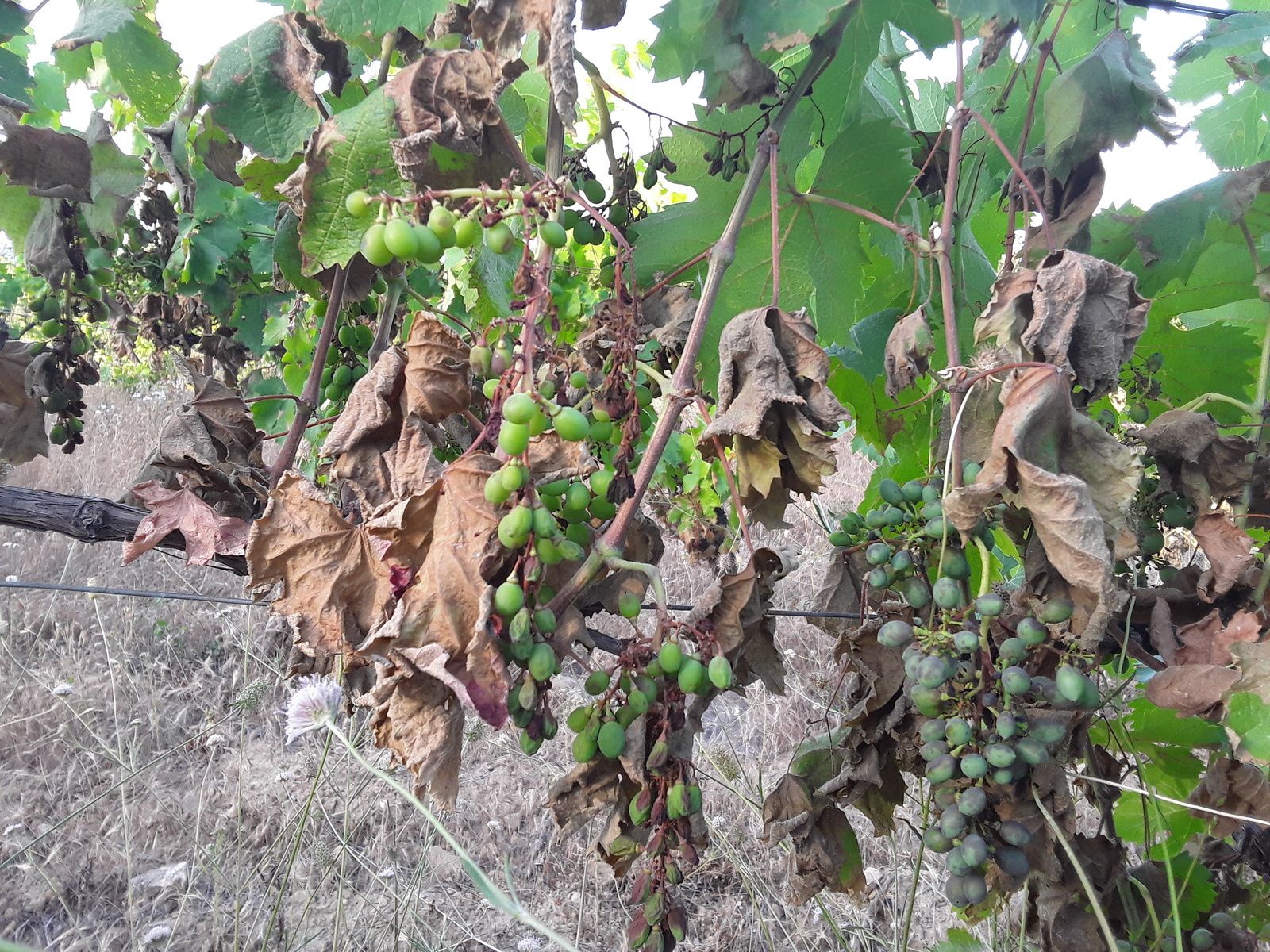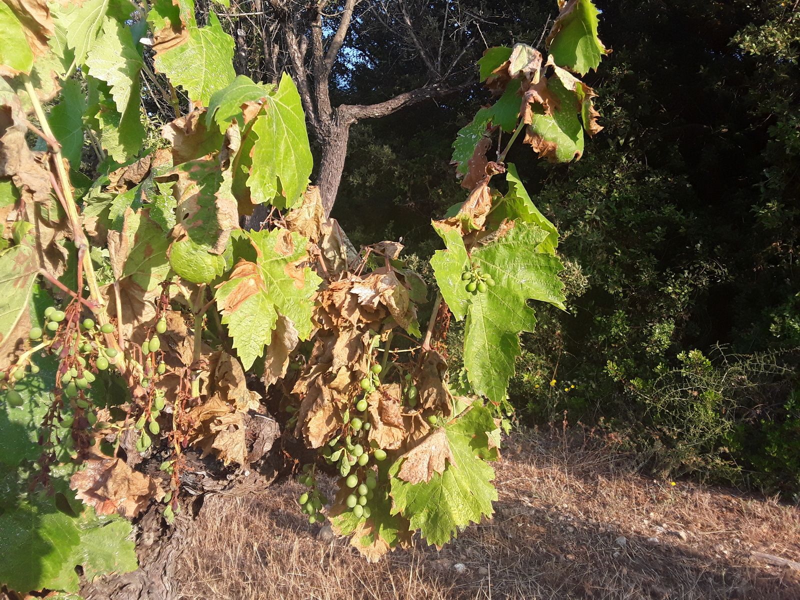 Nous ne sommes pas égaux devant les péripéties naturelle. Pour le cas, presque surnaturelle, car historique, sans préalable. Les parcelles exposés au plus chaud, les derniers traitements au souffre, les feuilles à cette période un peu plus fragiles en cette saison théoriquement moins chaude ont, comme un fœtus de paille, disparus sous l'intensité ,laissant par endroit des raisins amorphes orphelins de leur protection. Nos vignes à faibles rendement , à faible vigueur n'avaient-elles la capacité de résistance ? Que nenni, Du jamais vu !